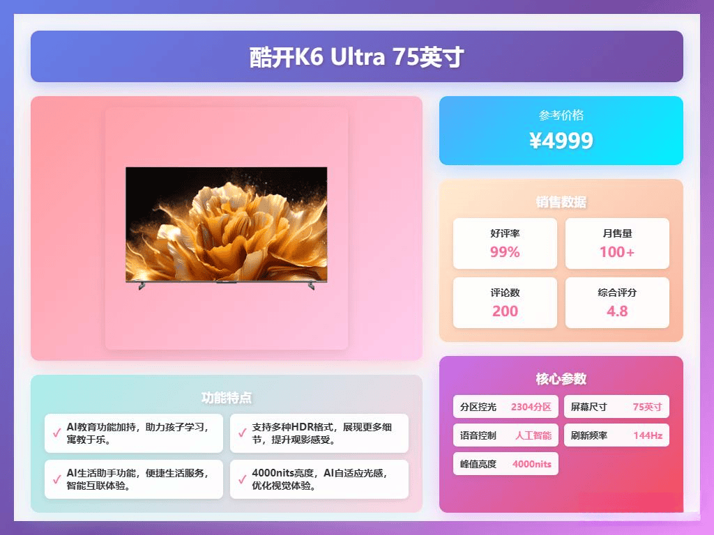这款电视的亮点还在于智能AI功能。搭载华星自研的AI大模型,能实现深度学习和内容智能推送,成为生活中的智能助手。配合AI画质芯片,画面能逐帧优化,轻轻松松实现从2K到4K的提升,细节丰富,色彩饱满。整体设计纤薄,便于贴墙安装,与家居环境融为一体,功能全面又实用。